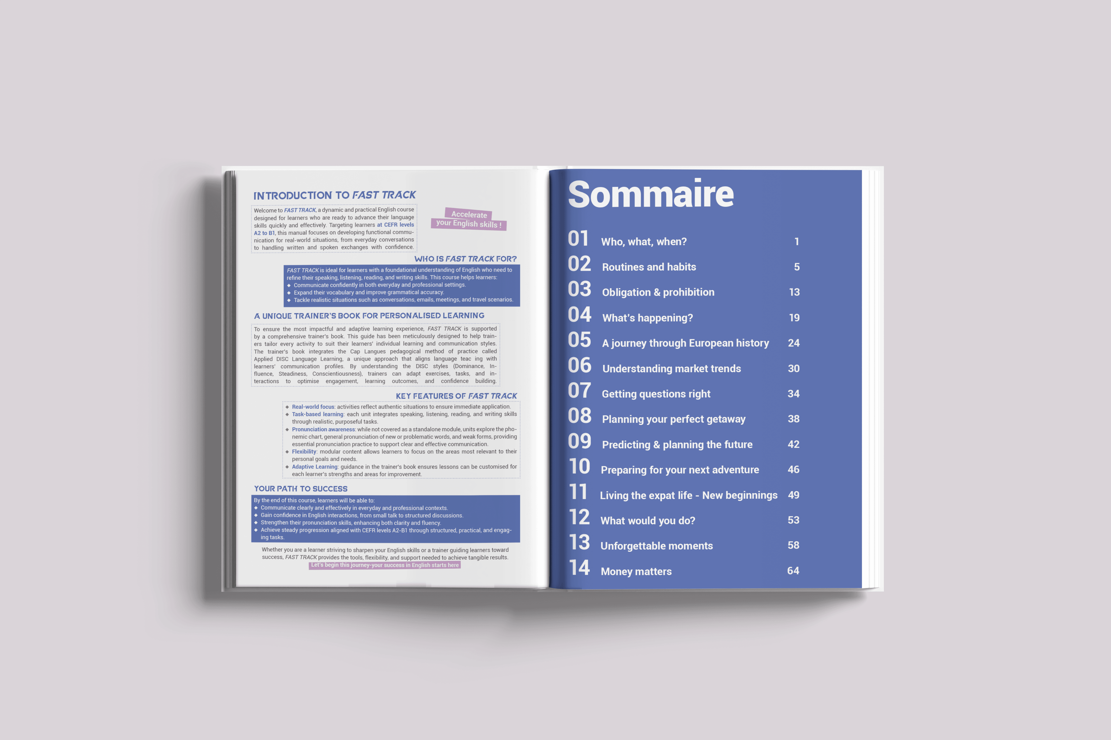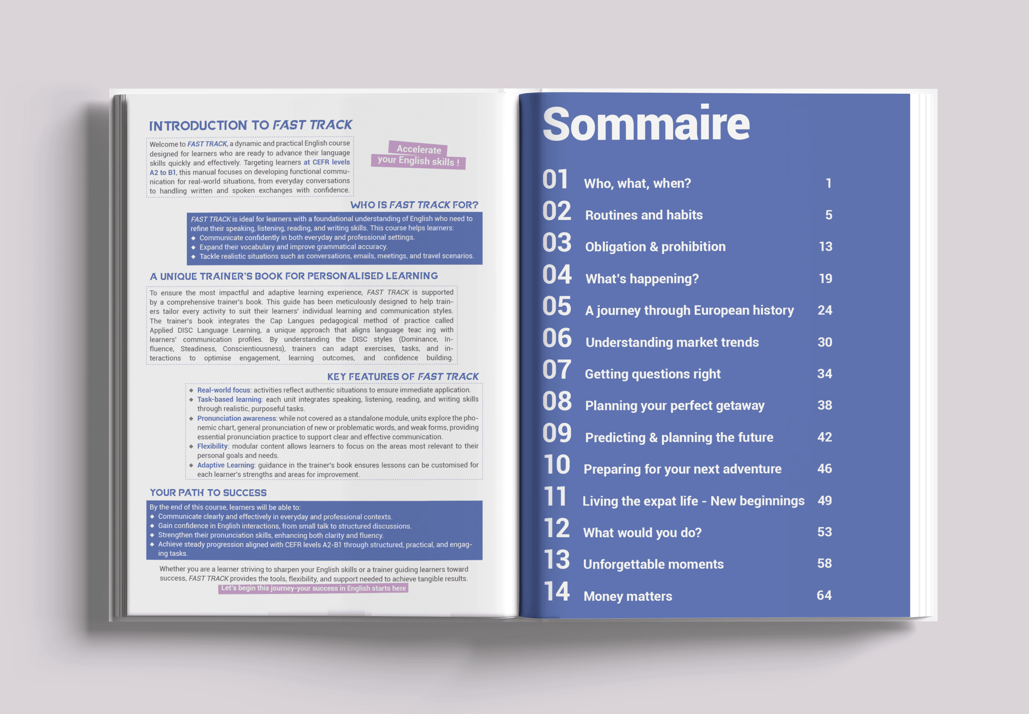 Cap Langue, centre de formation linguistique basé au Luxembourg. J’ai conçu la direction artistique et la mise en page complète d’un livre de formation en anglais, avec pour objectif de le rendre plus pédagogique, clair et visuellement attractif.