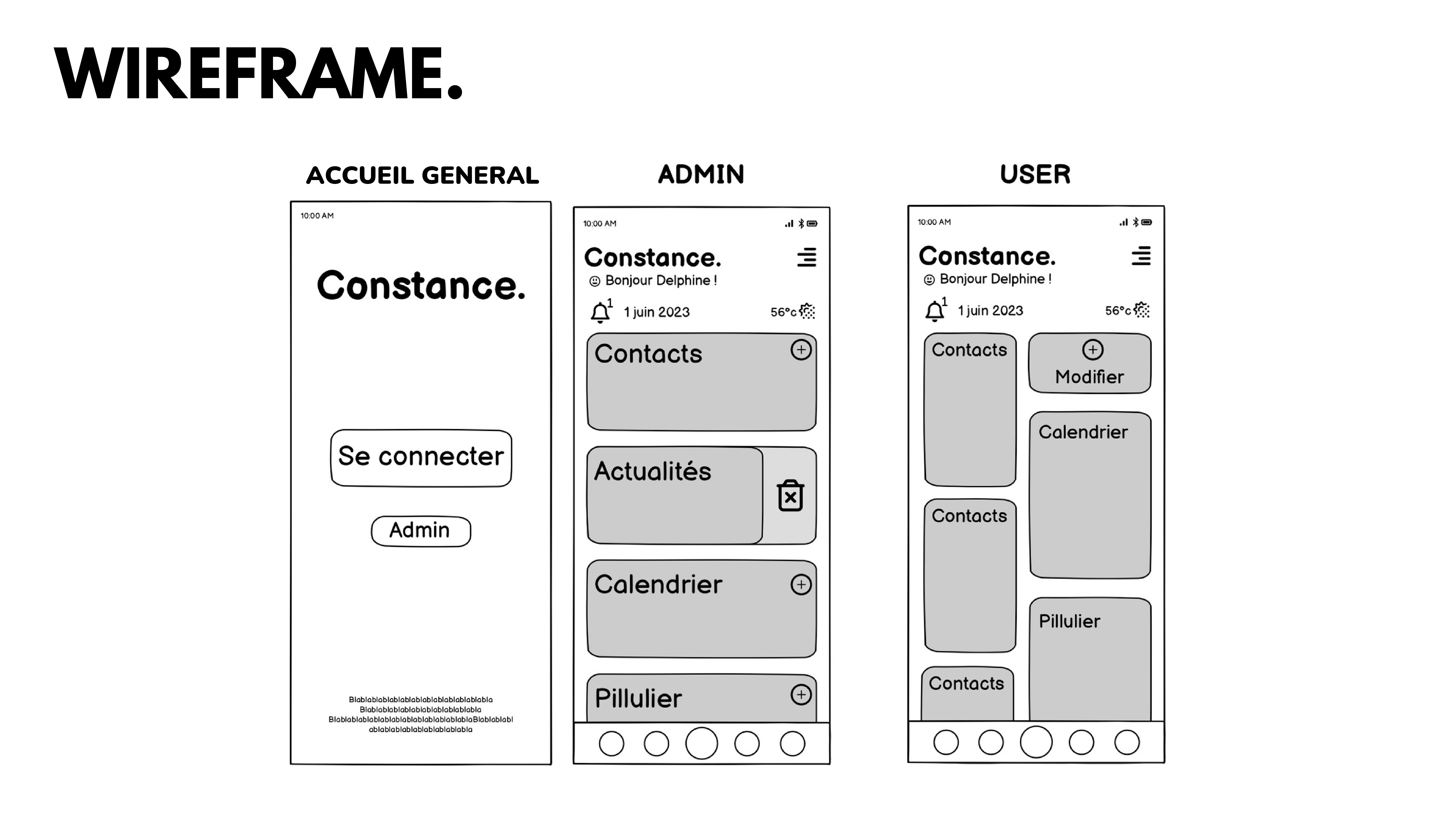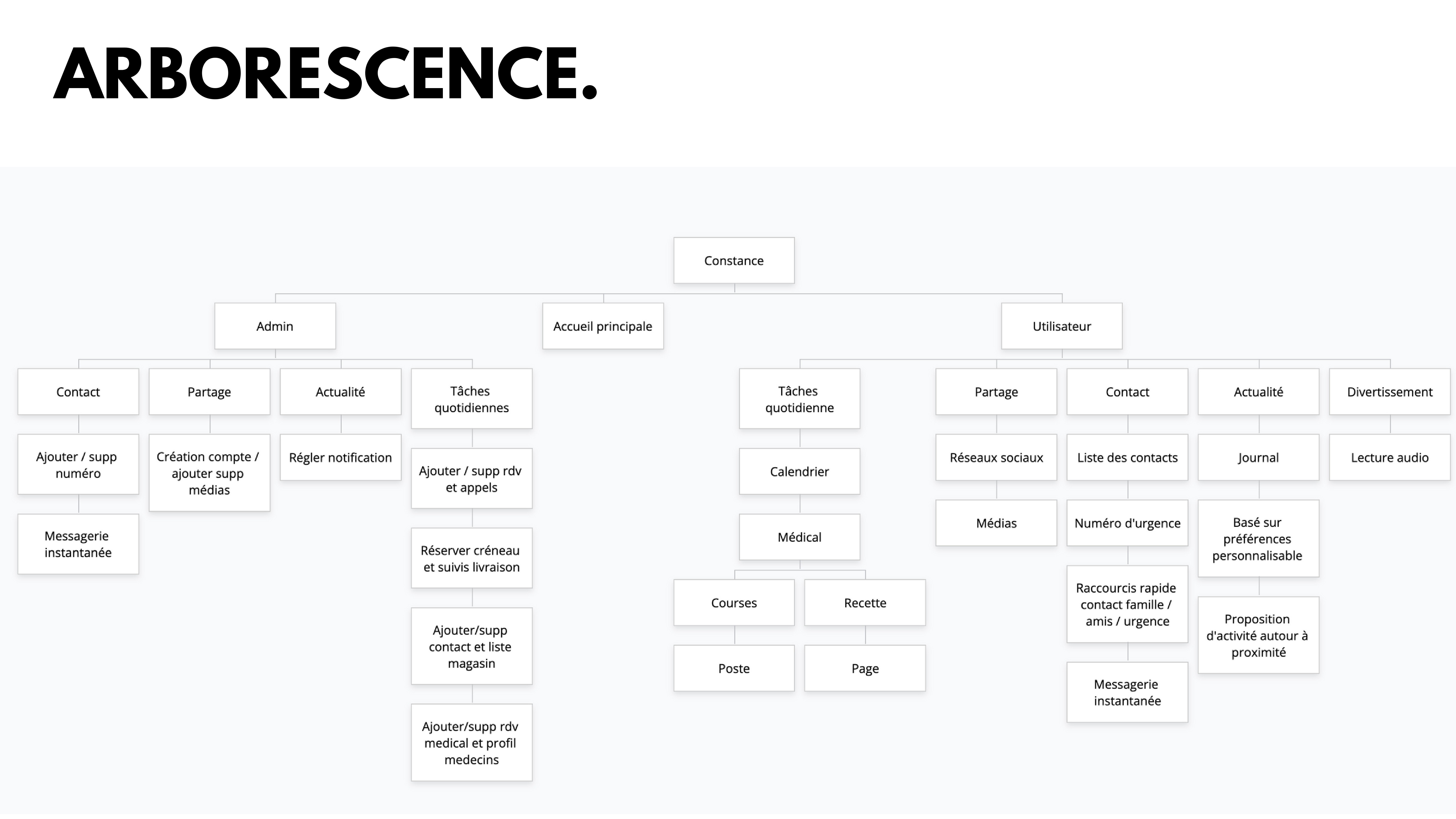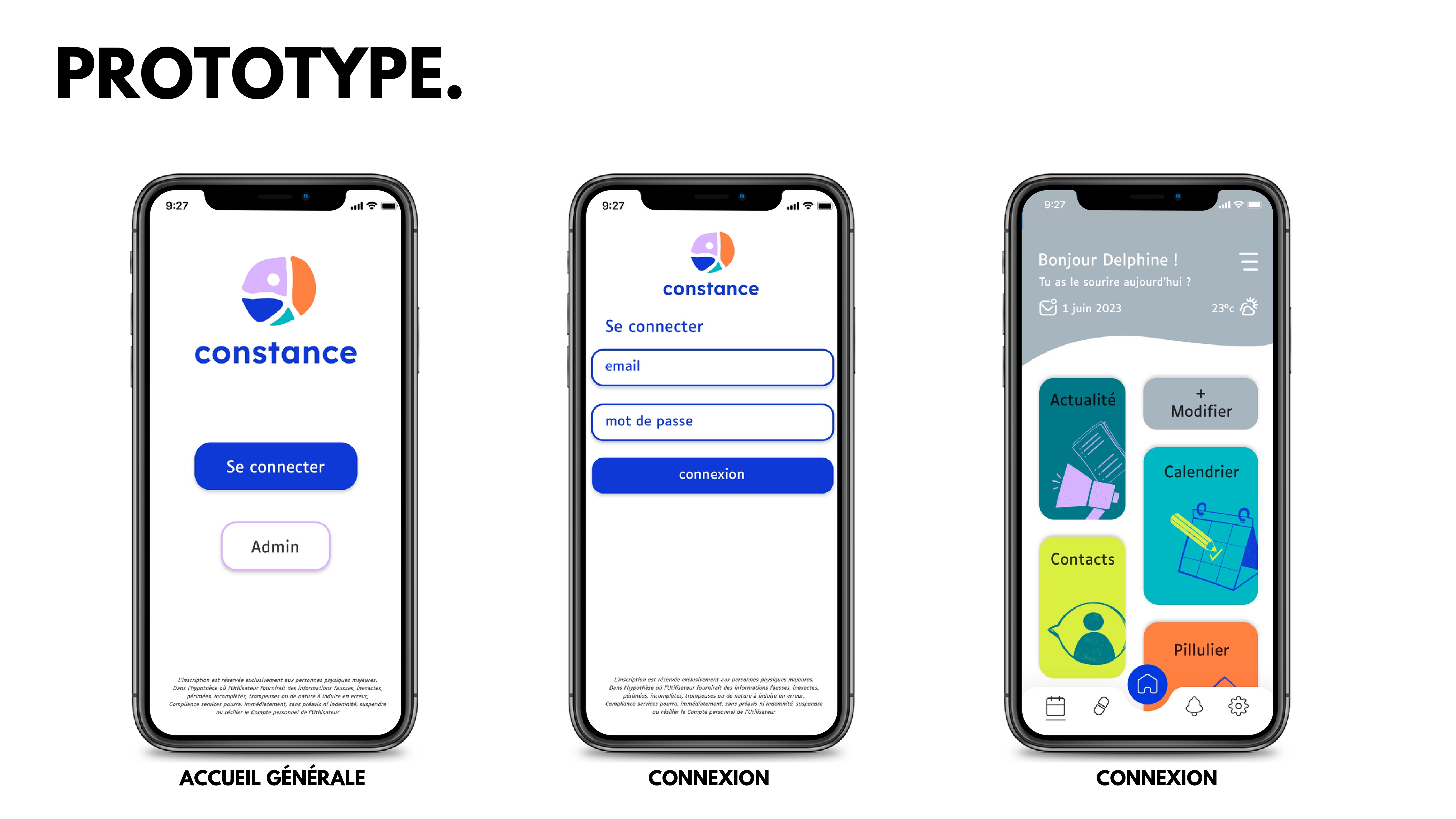Constance est une application fictive de e-santé pensée pour faciliter la vie des seniors et rassurer leurs proches. Disponible sur smartphone, tablette et télévision via un boîtier dédié, elle propose :