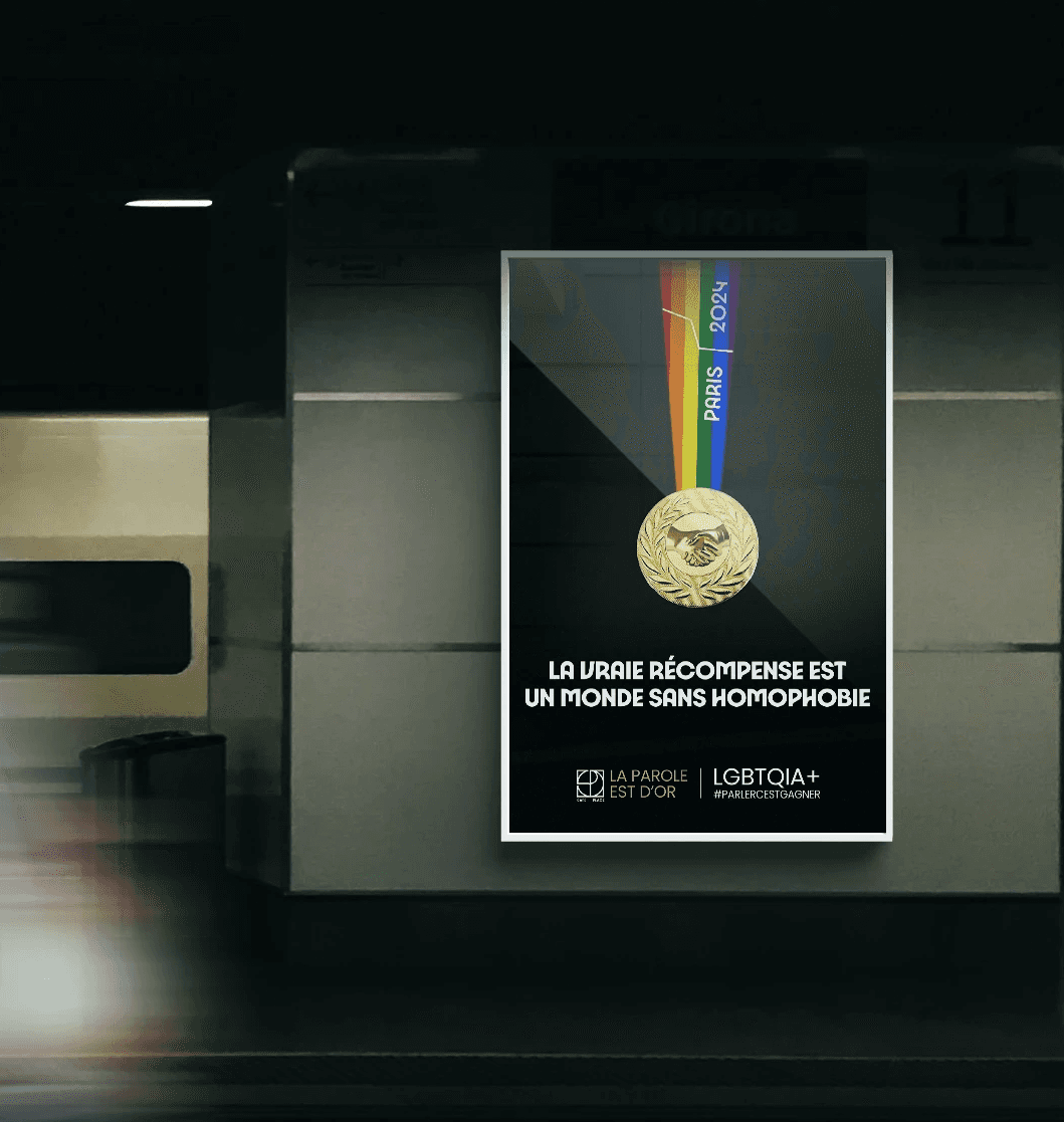 Projet réalisé dans le cadre du Club des DA : création d’une campagne publicitaire engagée en faveur de la cause LGBTQIA+ à l’occasion des JO de Paris 2024. En fusionnant les valeurs de l’olympisme et de l’inclusion, notre concept « La parole est d’or » encourage la prise de parole comme acte de courage et de victoire.