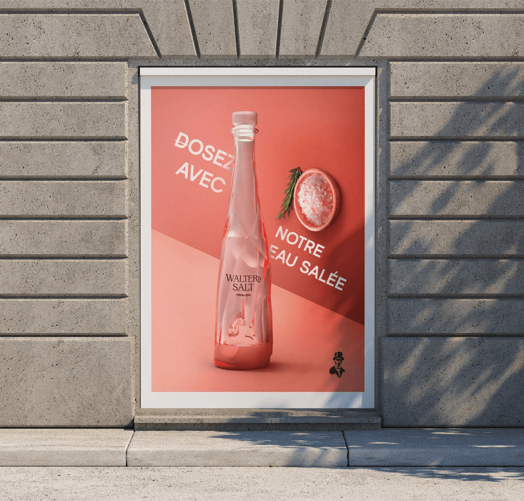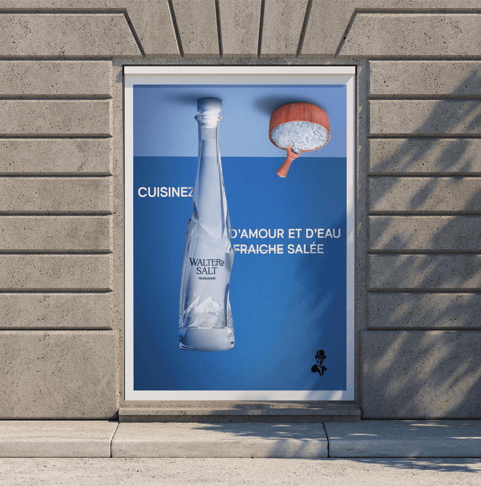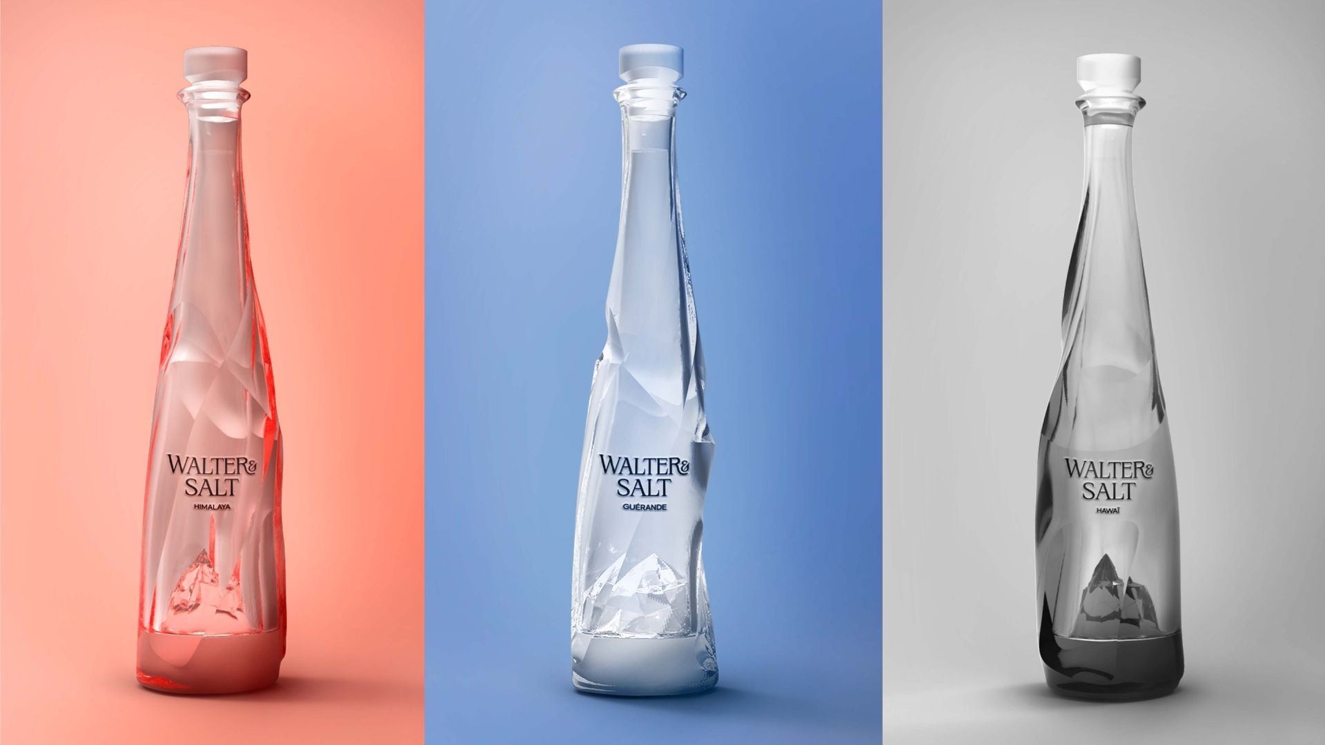 Walter & Salt est une marque fictive haut de gamme imaginée autour d’un objet volontairement “inutile” et loufoque : une bouteille d’eau salée prête à l’emploi pour cuire les pâtes. J’ai créé son univers visuel et conçu les packagings en 3D sous Blender, avec un design déstructuré et élégant symbolisant la pureté et l’origine des sels.